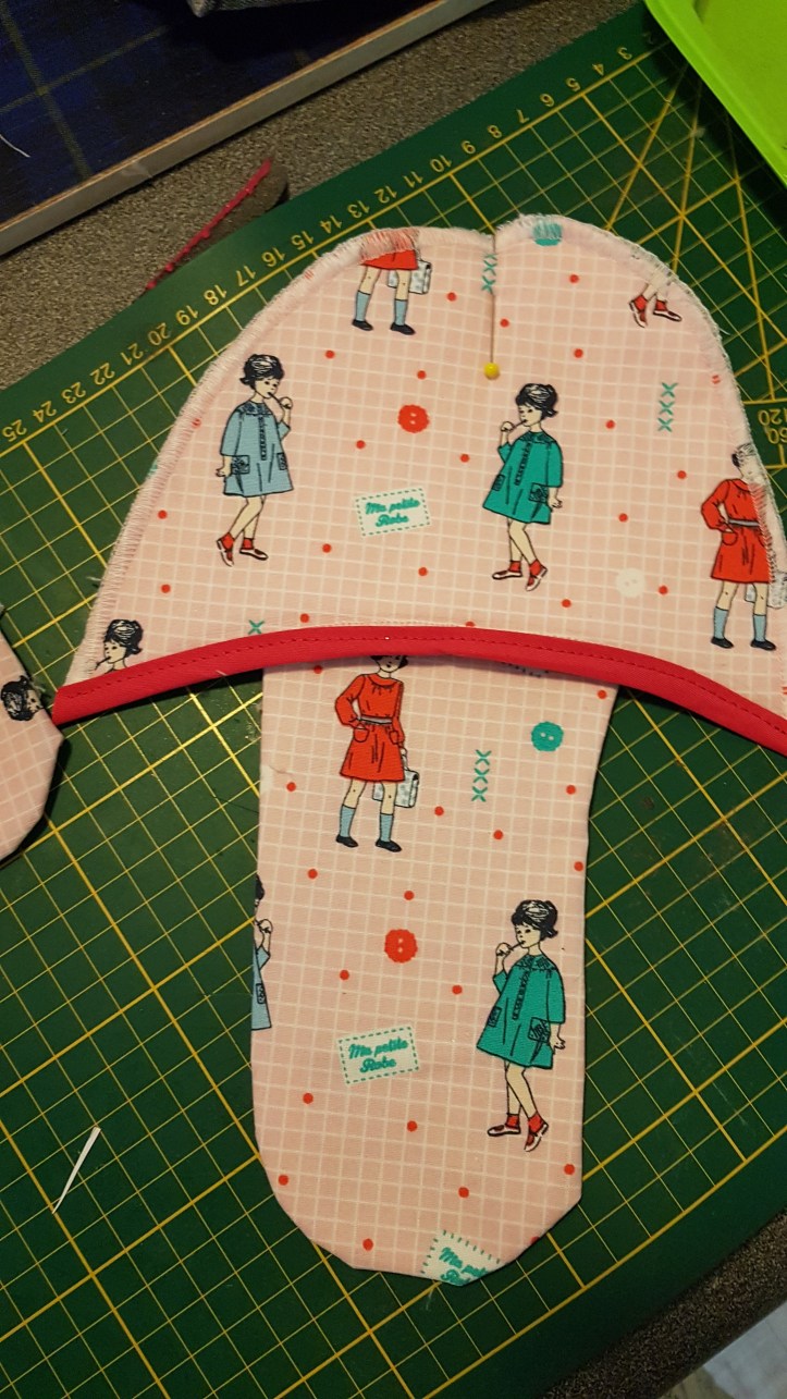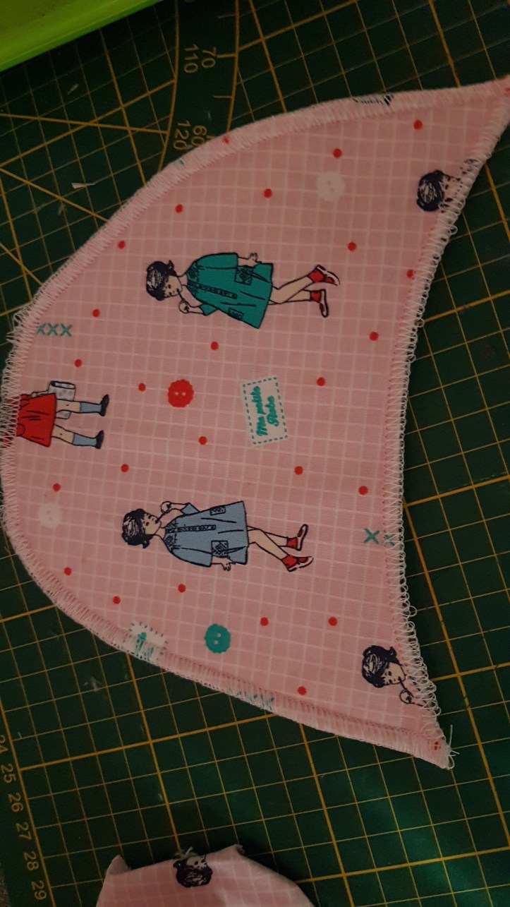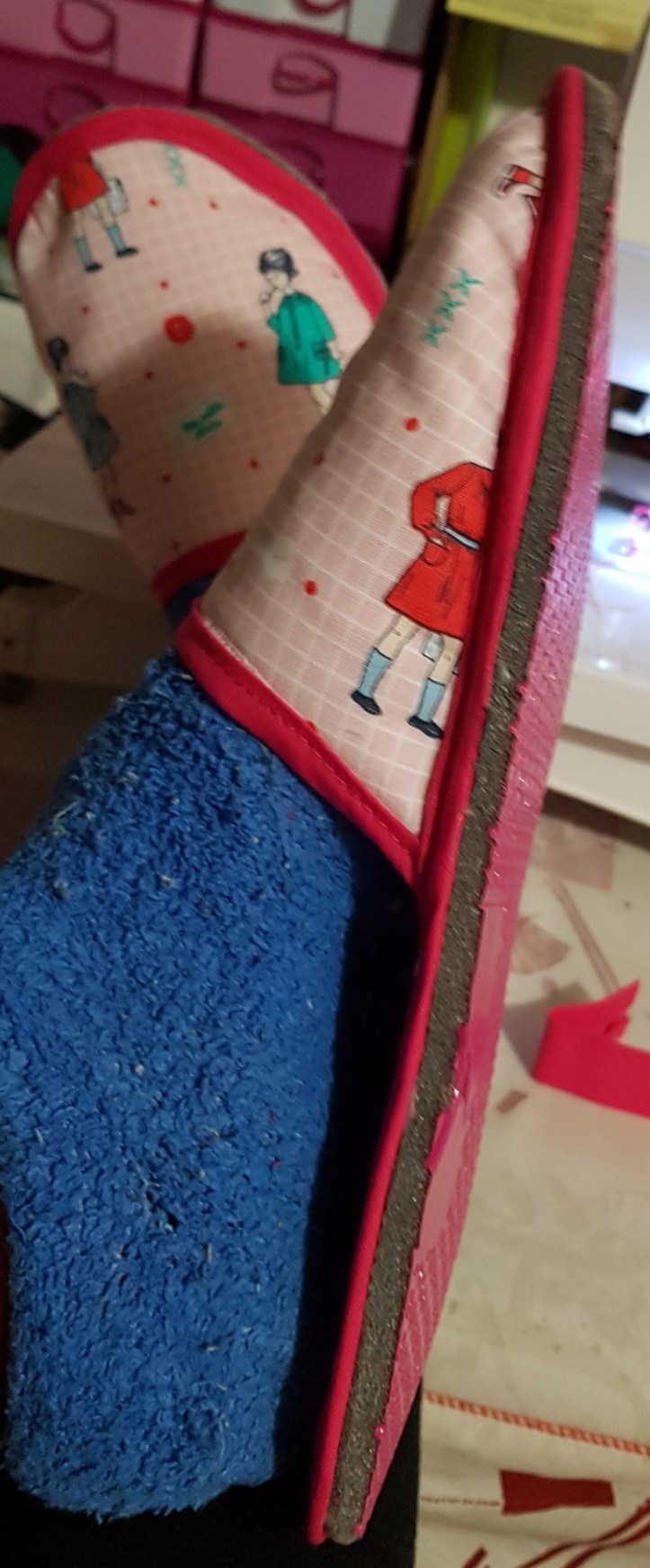 Ici j’ai collé le tissus de sur le molleton une face et coller aussi l’autre face toujours avec de la colle amovibles ensuite surjeter tout le tour